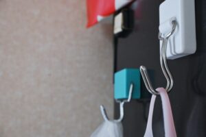 玄関ドアにマグネットフックを貼るだけで、鍵やマスク、エコバッグなどの細かいアイテムの定位置が完成します。「どこに置いたっけ?」と探す時間がなくなり、外出前の準備が驚くほどスムーズに。